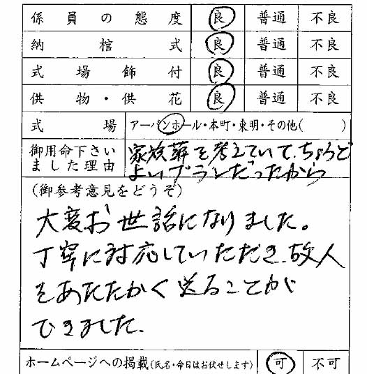 大変お世話になりました。 丁寧に対応していただき、故人をあたたかく送ることができました。