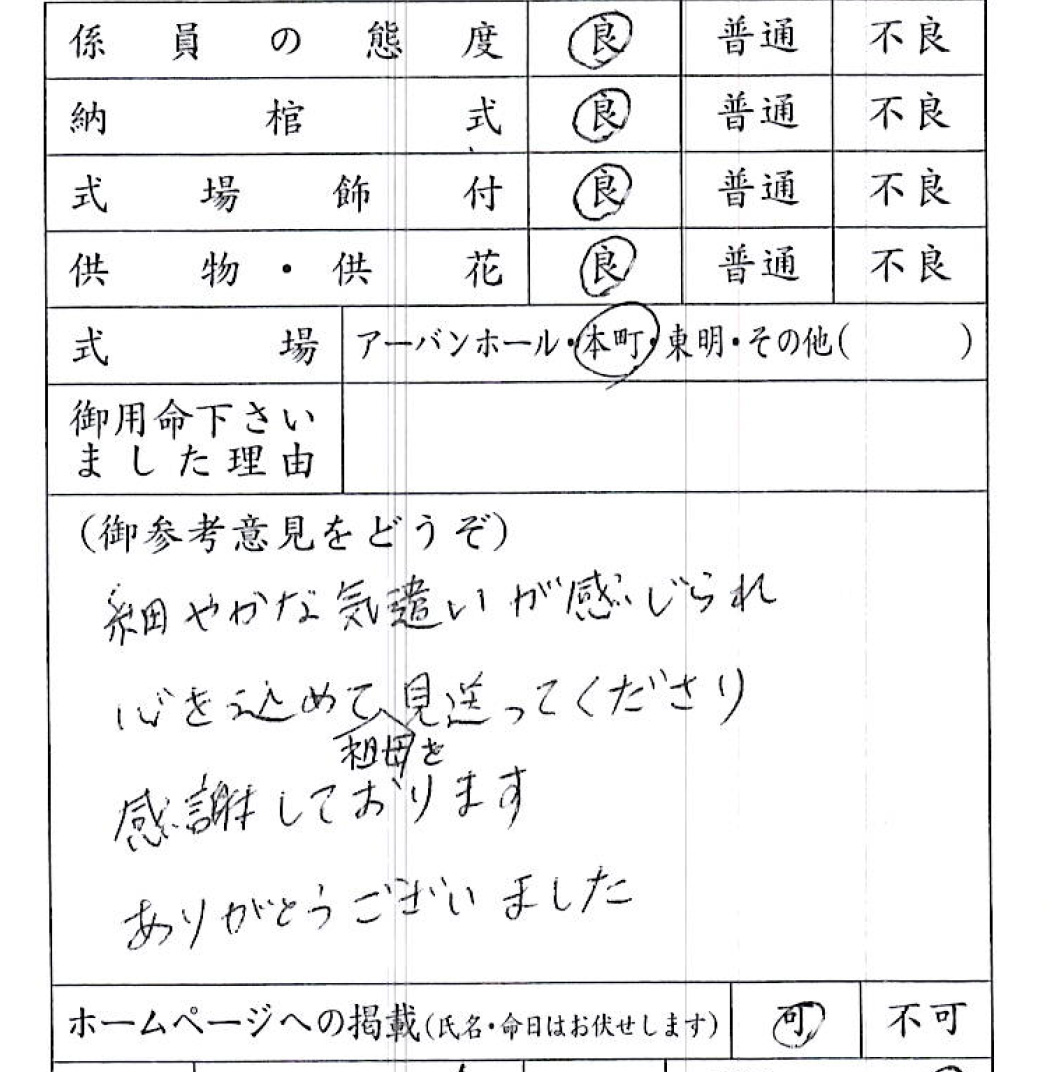細やかな気遣いが感じられ、心を込めて祖母を見送ってくださり感謝しております。 ありがとうございました。