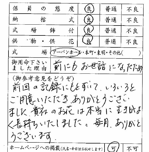 前回の記録に基づいて、いろいろとご用意いただき、ありがとうございました。 貴社のお花は本当に活きがよく長持ちいたしました。 毎月ありがとうございます。