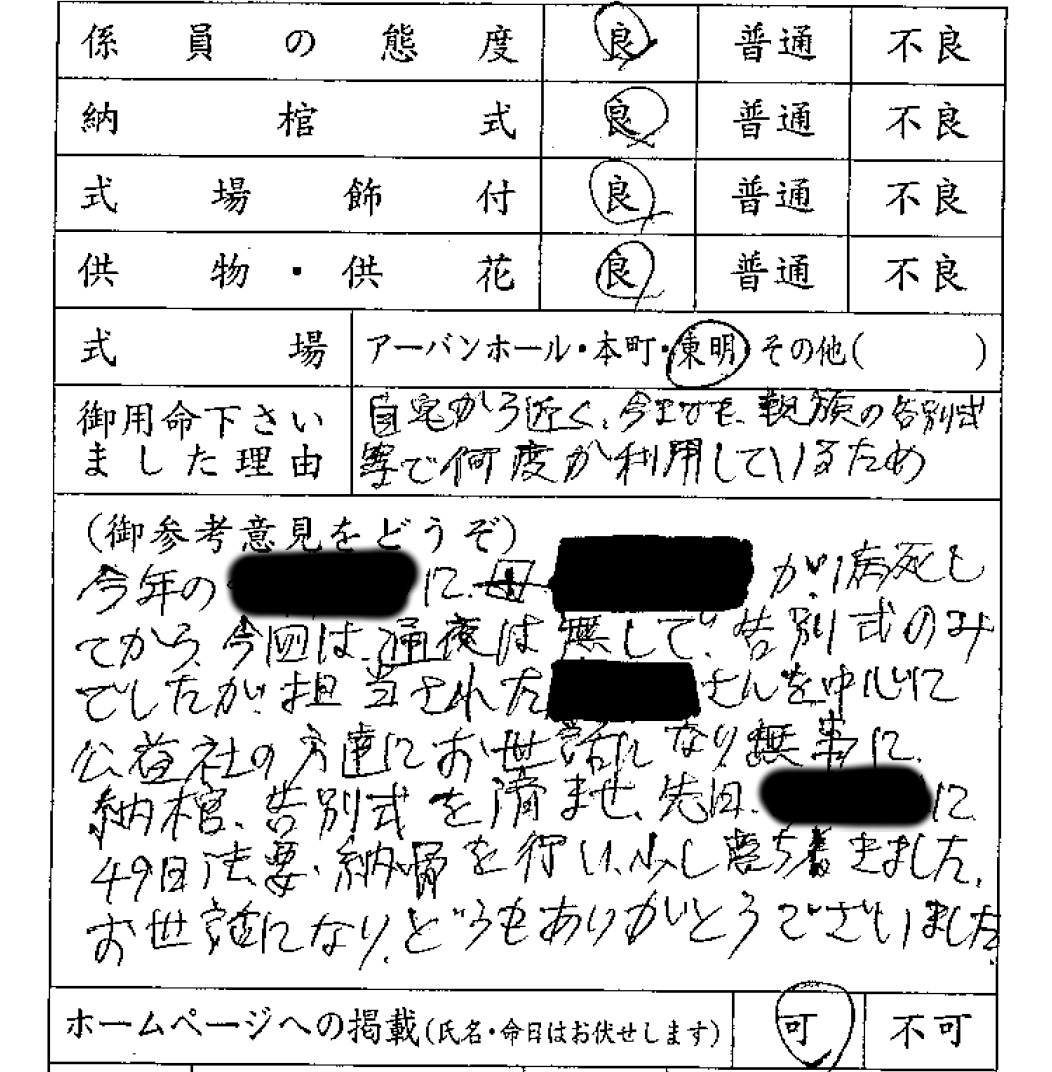 今年の●/●(●)に、母〇〇が病死してから、今回は、通夜は無しで、告別式のみでしたが、担当された●●さんを中心に、公益社の方達にお世話になり、無事に納棺、告別式を済ませ、先日●/●(●)に49日法要、納骨を行い、少し落ち着きました。 お世話になり、どうもありがとうございました。