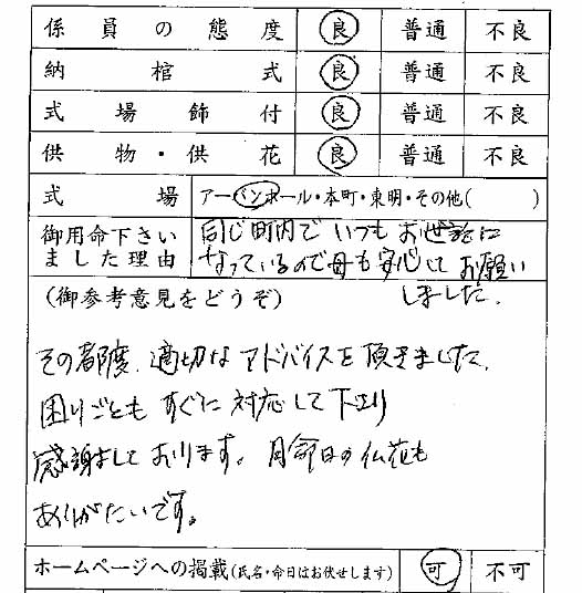 その都度、適切なアドバイスを頂きました。 困りごともすぐに対応して下さり感謝しております。 月命日の仏花もありがたいです。
