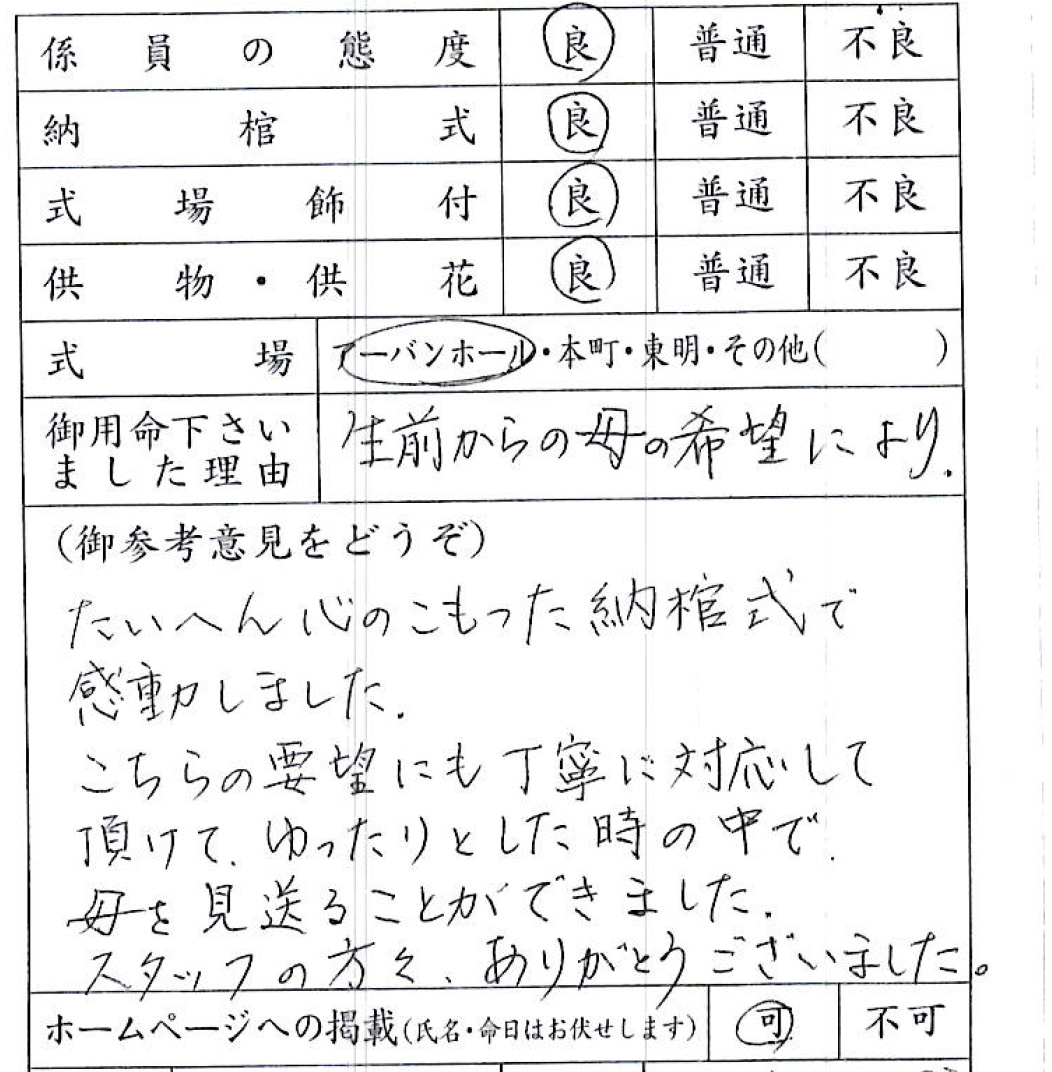 たいへん心のこもった納棺式で感動しました。 こちらの要望にも丁寧に対応して頂けて、ゆったりとした時の中で母を見送ることができました。 スタッフの方々、ありがとうございました。