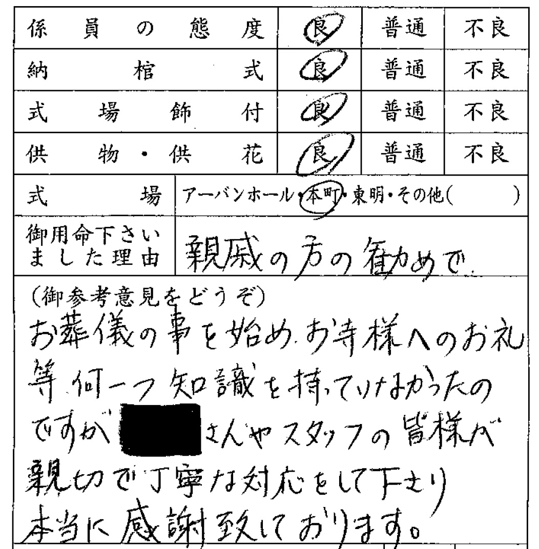 お葬儀の事を始め、お寺様へのお礼等、何一つ知識を持っていなかったのですが、○○さんやスタッフの皆様が親切で丁寧な対応をして下さり本当に感謝致しております。