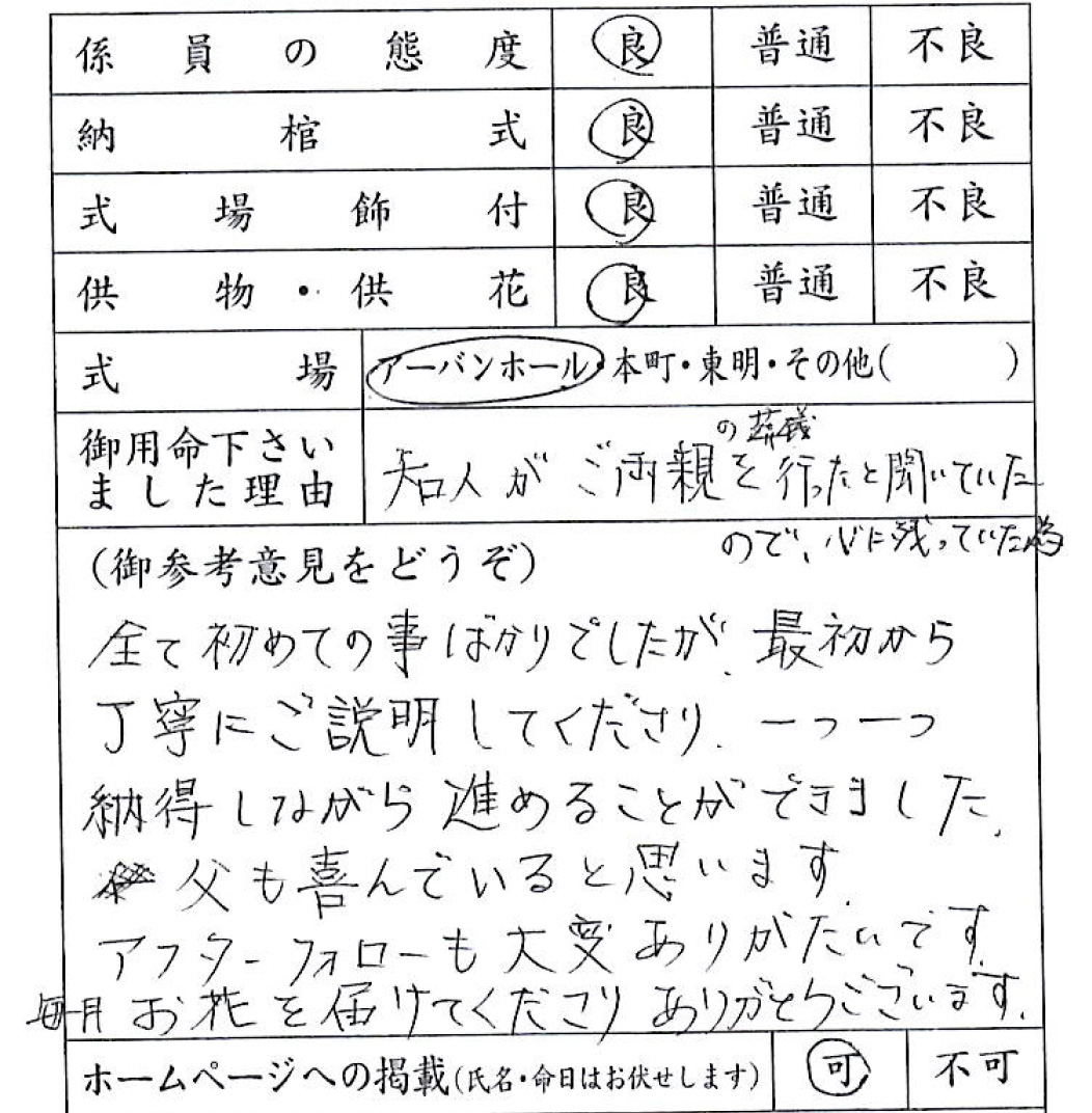 全て初めての事ばかりでしたが、最初から丁寧にご説明してくださり、一つ一つ納得しながら進めることができました。父も喜んでいると思います。 アフターフォローも大変ありがたいです。 毎月お花を届けてくださりありがとうございます。