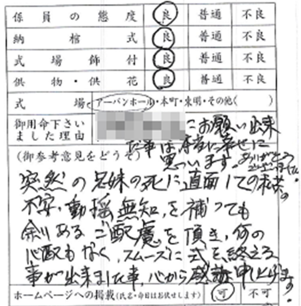 突然の兄妹の死に直面しての私共の不安、動揺、無知を補っても余りあるご配慮を頂き、何の心配もなく、スムーズに式を終える事が出来ました事、心から感謝申し上げます。
